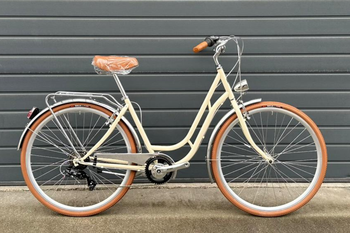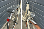 Delantera y trasera LED, a baterías. La luz delantera viene desmontada, se puede montar tanto en la cabeza de la horquilla, o a un lateral de esta en un anclaje del freno v-brake, para que no haya conflicto con la cesta.