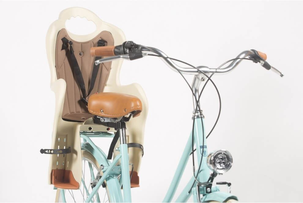 Kinderfahrradsitz mit mitgelieferter Halterung zur einfachen Befestigung am Gepäckträger.