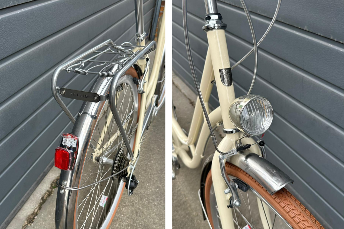 Vordere und hintere LED, batteriebetrieben. Das Vorderlicht wird unmontiert geliefert, es kann entweder am Gabelkopf oder an der Seite der Gabel an einer V-Brake-Halterung montiert werden, so dass es keinen Konflikt mit dem Korb gibt.