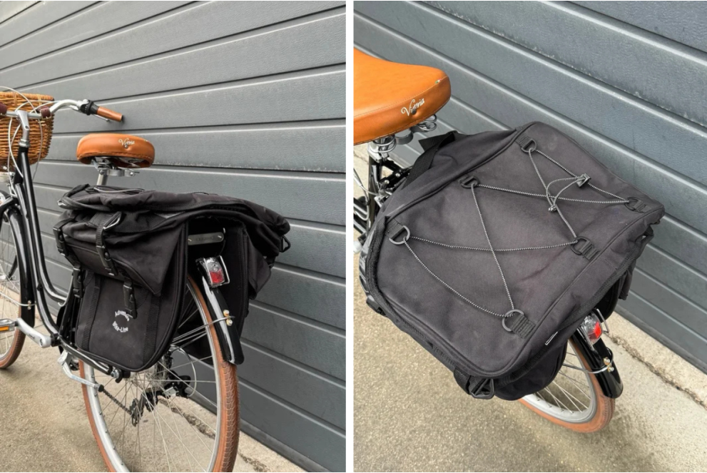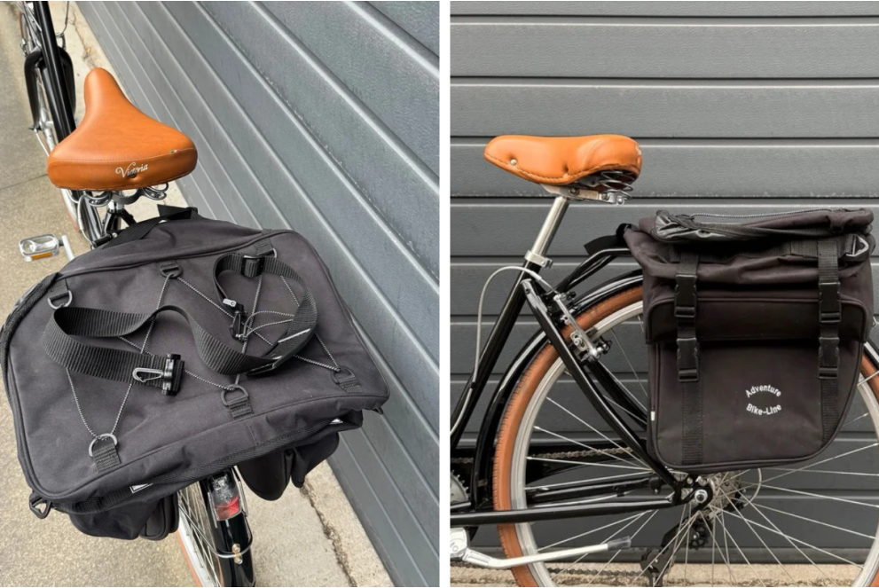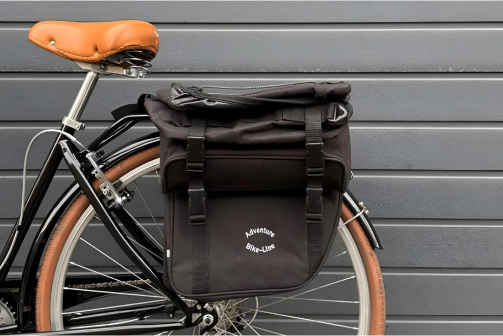 Adventure Bike-Line Black Panniers. High-capacity system featuring two side modules and a top compartment. The top bag is easily detachable via clips and includes a strap, allowing it to be used as a backpack or shoulder bag.